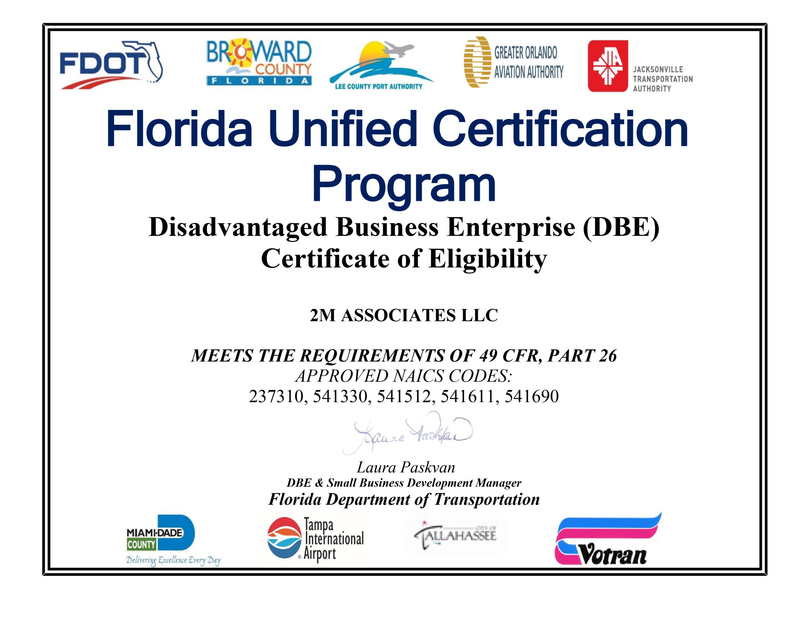 | DBE CERTIFIED (FLORIDA): | F-12158 |